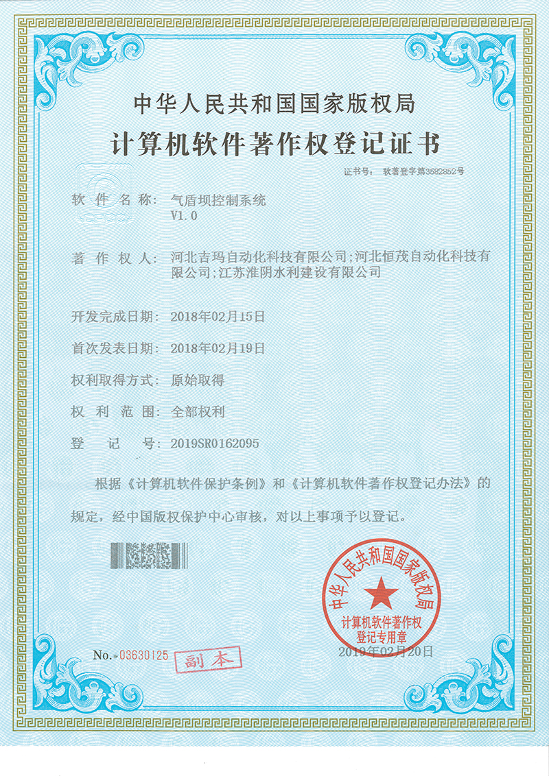 气盾坝控制系统软件著作权登记证书